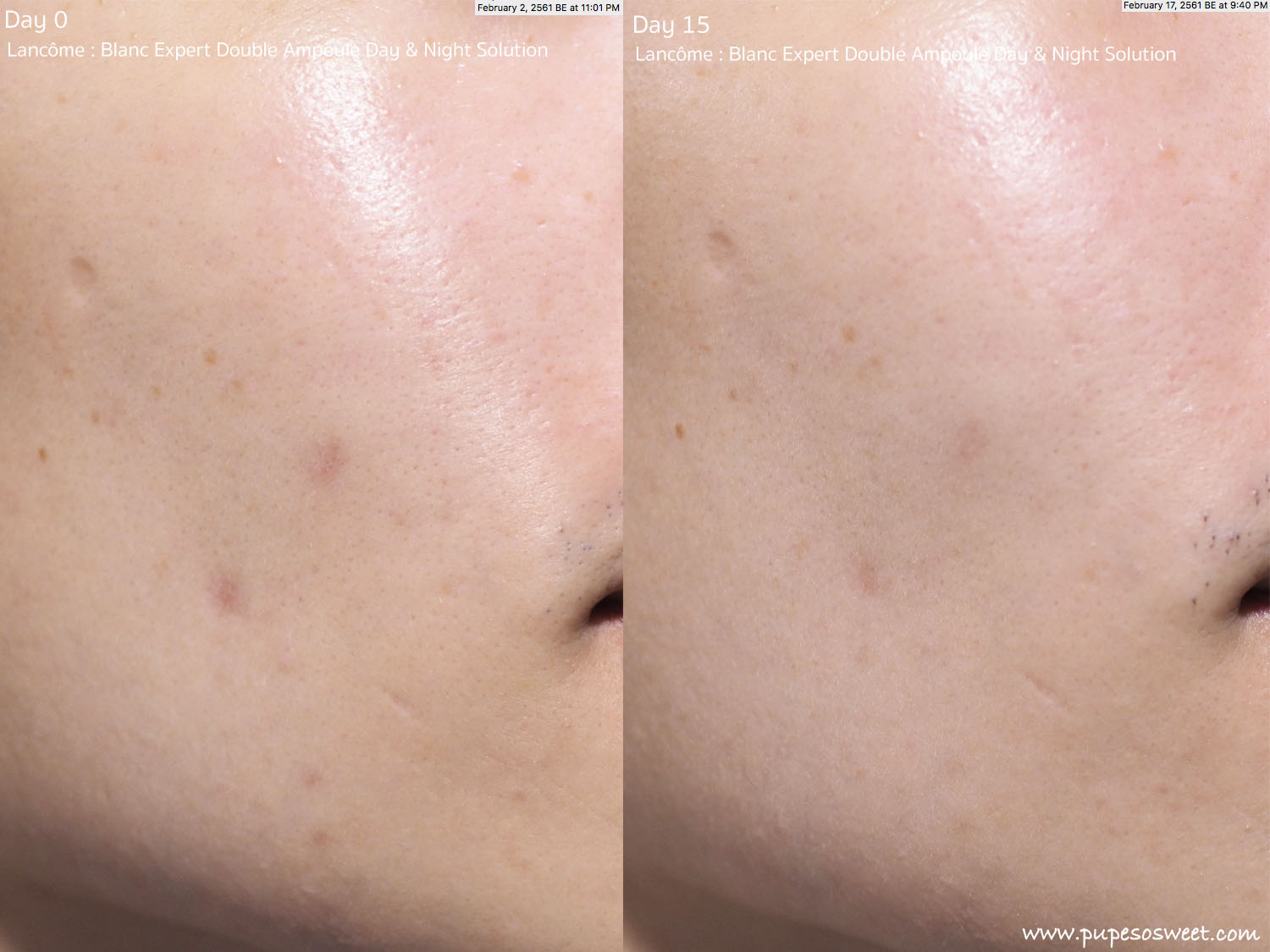 ก่อนที่จะเริ่มใช้ผลิตภัณฑ์เป็นเวลา 6 วัน ได้มีการไปกดสิวและใช้เครื่องมือในการดูดและฉายแสงเพื่อฆ่าเชื้อ และดูแลผิวด้วยผลิตภัณฑ์พื้นฐานที่เน้นความชุ่มชื้นและปกป้องผิวโดยไม่การใช้ผลิตภัณฑ์ไวท์เทนนิ่งอื่น ๆ เมื่อสะเก็ดแผลหลุดแล้วจึงนับเป็น Day 0 เพื่อเริ่มทดลองใช้ Lancôme : Blanc Expert Double Ampoule Day & Night Solution เป็นระยะเวลา 15 วัน (เพราะหลังจากนั้นก็ไปเช็คผิวกับคลีนิคที่ไปทำการกดสิว และมีการยิง V-Beam ที่รอยสิวเพื่อให้รอยจางไวขึ้น ซึ่งจะรบกวนกับการทดลองผลิตภัณฑ์ จึงขอตัดจบก่อนที่จะครบ 21 วันตามที่แบรนด์เคลมไว้) ในระหว่าง 15 วัน ไม่มีการใช้ผลิตภัณฑ์ที่มีคุณสมบัติเป็นไวท์เทนนิ่งหรือผลัดเซลล์ผิวอื่น